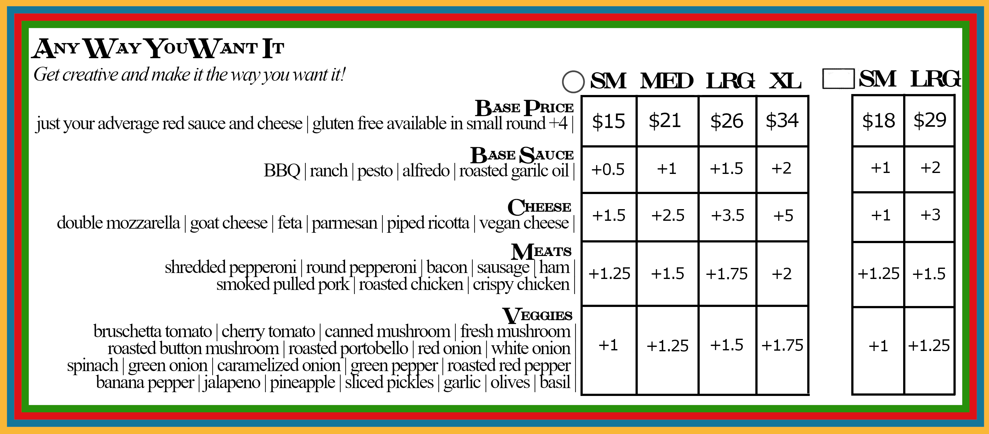 Red sauce OR BBQ base, mozza,shredded pepperoni, smoked pulled pork, ham, sausage, bacon
